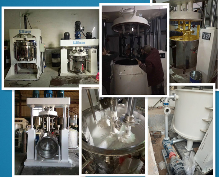 是一種多功能、強制性攪拌機,釜內(nèi)有三根不同形式的攪拌器,其中一根低速攪拌器在繞釜體軸線轉(zhuǎn)動,其余兩根高速攪拌裝置又以不同的轉(zhuǎn)速繞自身軸線高速自轉(zhuǎn),使物料在釜內(nèi)作復雜的運動,受到強烈的剪切和混合。設備內(nèi)山形刮壁刀繞釜體軸線轉(zhuǎn)動,將粘在壁上和底部的原料刮出參與混合,使其效果更為理想。設備密封性好,可電加熱(水冷卻)抽真空,具有良好的排氣除泡。強力分散機缸蓋可液壓升降,缸體可自由移動,操作十分方便。強力分散機攪拌器的形式,根據(jù)物料要求可為多層槳葉式、框式、蝴蝶式、葉輪式等。攪拌機通常配套系列液壓擠出機,以實現(xiàn)膏狀物料的擠出。